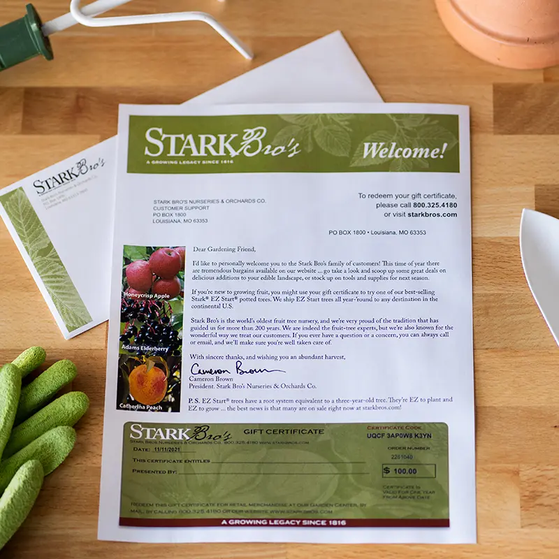 Our gift certificates are a wonderful way to enrich the life of any gardening friend or family member. Ideally, every gardener’s wish is to choose exactly the tree or plant they want. Unlike so many other gifts, a fruit tree or berry plant from Stark Bro’s will last for years — even generations.